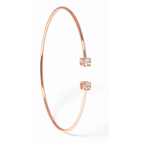 Bransoletka Le Cube Diamant small w różowym złocie z diamentami. Sztywny design o czystych liniach bawi się kodami geometrycznymi Maison. Ażurowa kostka na wszystkich czterech bokach pozwala światłu swobodnie przenikać, podkreślając diamenty.