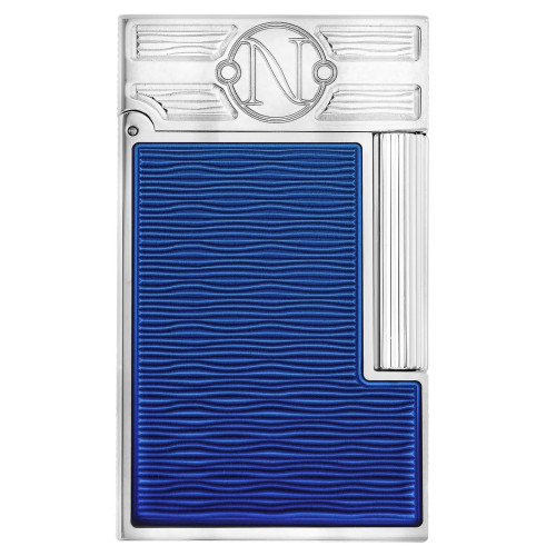 Zapalniczka Linia 2 Cling z giloszowanym wzorem pod lakierowanym wzorem „fala”. Pokryta niebieskim lakierem gradientowym S.T. Dupont. Kapelusz z delikatnym giloszem. Wykończenie palladowe. Wyposażony w podwójny żółty płomień i słynne "Cling" przy otworze.