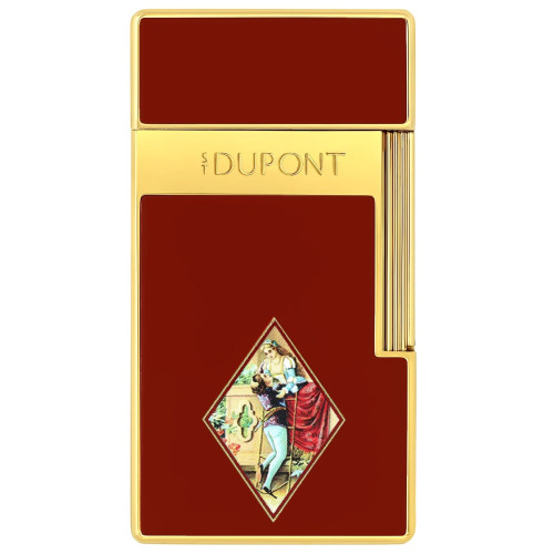 Duża zapalniczka w czerwonym lakierze z motywem Romea i Julii, wykonana z lakieru z nadrukiem. Błyszczące złote wykończenie. Wyposażone w niebieski płomień o średnicy 2 cm, idealny do zapalania świec lub papierosów.